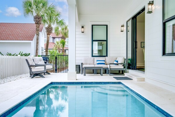 - Pool deck with private HEATED pool, a gas grill, and lounge seating