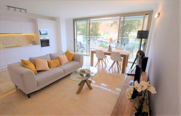 Este impecable apartamento cuenta con un área de estar / comedor de planta abierta bellamente amueblada y espaciosa (que incluye Smart TV, DVD y Wifi gratuito), una mesa de comedor de roble macizo y una cocina de alta especificación que incluye horno, microondas, lavavajillas, refrigerador, congelador y cafetera. Este espacio contemporáneo conduce a un 24sq. metro (250 pies cuadrados) terraza privada a través de puertas corredizas de vidrio de longitud completa, creando una transición perfecta entre la vida interior y exterior, que ofrece excelentes vistas del complejo, el valle y el mar.