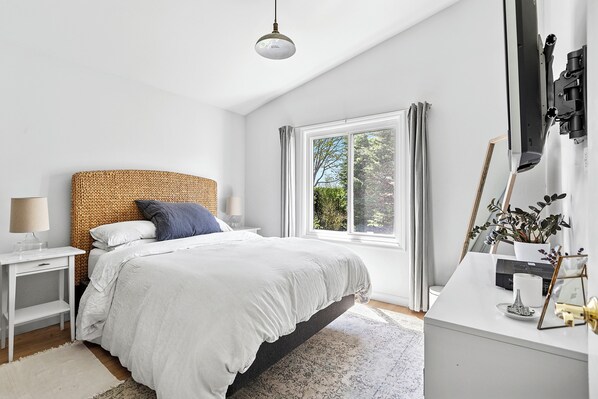 Come inside and see the beautiful new renovation. It includes high-end appliances, lighting & fixtures as well as excellently chosen furnishings, and a well-planned layout. Tranquility reigns supreme when you’re inside this light-filled home. Sunlight floods the house all day long with two large sliders and plenty of windows. Cozy up on the couch and lounge around the tastefully decorated living room. The homeowner painstakingly removed all nails and blemishes from a 30-year old deck, and transformed those beautifully weathered boards into dining tables, coffee tables, headboards & more. The kitchen is fully equipped, and the house offers two dining tables suitable for 6, one inside and one outside.