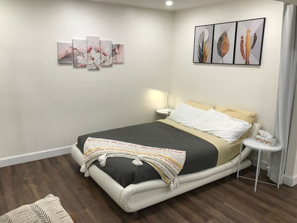 Even though it`s a basement space, the room is wonderfully lit, offering a warm and inviting ambiance. The soft, ambient lighting—highlighted by the charming string lights adorning the curtain that separates the main bed from the living area—adds a cozy touch. A comfortable sofa bed is available for one, ensuring extra convenience and versatility. The space is thoughtfully designed to feel open and welcoming, creating a relaxing, homey atmosphere even without natural light. The large bathroom and kitchenette are fully equipped with all the essentials to accommodate up to three guests.