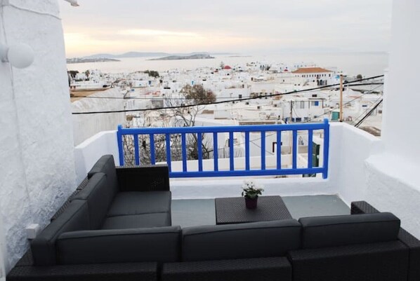 This traditional, centrally located split level house, is newly renovated and fully equipped. The dreamy sea view balcony is the perfect spot to sea the sunset and to gaze the famous Mykonos town. The space The air-conditioned 40sqm house sleeps up to 5 people,has a small kitchen/dining area and a huge furnished veranda. It consists of 2 double beds and 1 sofa bed.Has an outdoor renovated bathroom (with full privacy of course) and an indoor WC