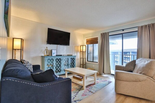 This 2 bedroom / 2 bathroom (950 sq ft) condo is located in the Myrtle Beach Resort's oceanfront "A Building" on the fifth floor. The unit sleeps up to 5 people - bed linens and towels are provided for your convenience! The main living area is open, spacious, and beautifully decorated. There is a large mounted flat screen tv in the living room that offers a variety of streaming options - and a premium cable package with on demand movies and television shows. A sofa is also located in the living room, as well as an oversized recliner. The coffee table is on casters making it easier to move this piece of furniture for more space! The master bedroom has a low-profile queen bed with a pillow top mattress. A long dresser and closet offer plenty of storage space for your stay! The flat screen tv also offers streaming capabilities and premium cable package. In the master bathroom you will find a beautiful walk-in shower. The stylish vanity offers additional storage space including drawers. The second bedroom has a twin bunk bed, surf themed cabinet, and closet. A 3 in 1 chair can be folded down to make a relaxing lounge chair by day or an additional sleeping place by night (this chair is firm and narrow, best suited for a child when used as a bed). The mounted tv in the second bedroom has a premium cable package and streaming capabilities. The second bathroom has a tub/shower combo and a stylish vanity with storage under the sink. Both bathrooms are equipped with bath and hand towels, as well as wash cloths and individually wrapped facial wipes.