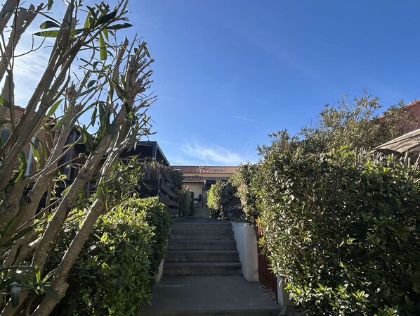 Ventajas de este alojamiento vacacional: Terraza a la sombra con mobiliario de jardín, residencia con piscina compartida.