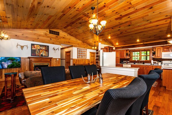plenty of counter space with bar seating and everything you would possibly need to prepare an old fashioned country meal. The large wood dining table can easily accommodate your group’s meals or card games. The living room contains a large 50“ smart TV and comfortable seating. The French doors in the living room lead you to the full length, covered back deck where you can relax, listen to the birds sing, and watch the gold finches at the bird feeder.