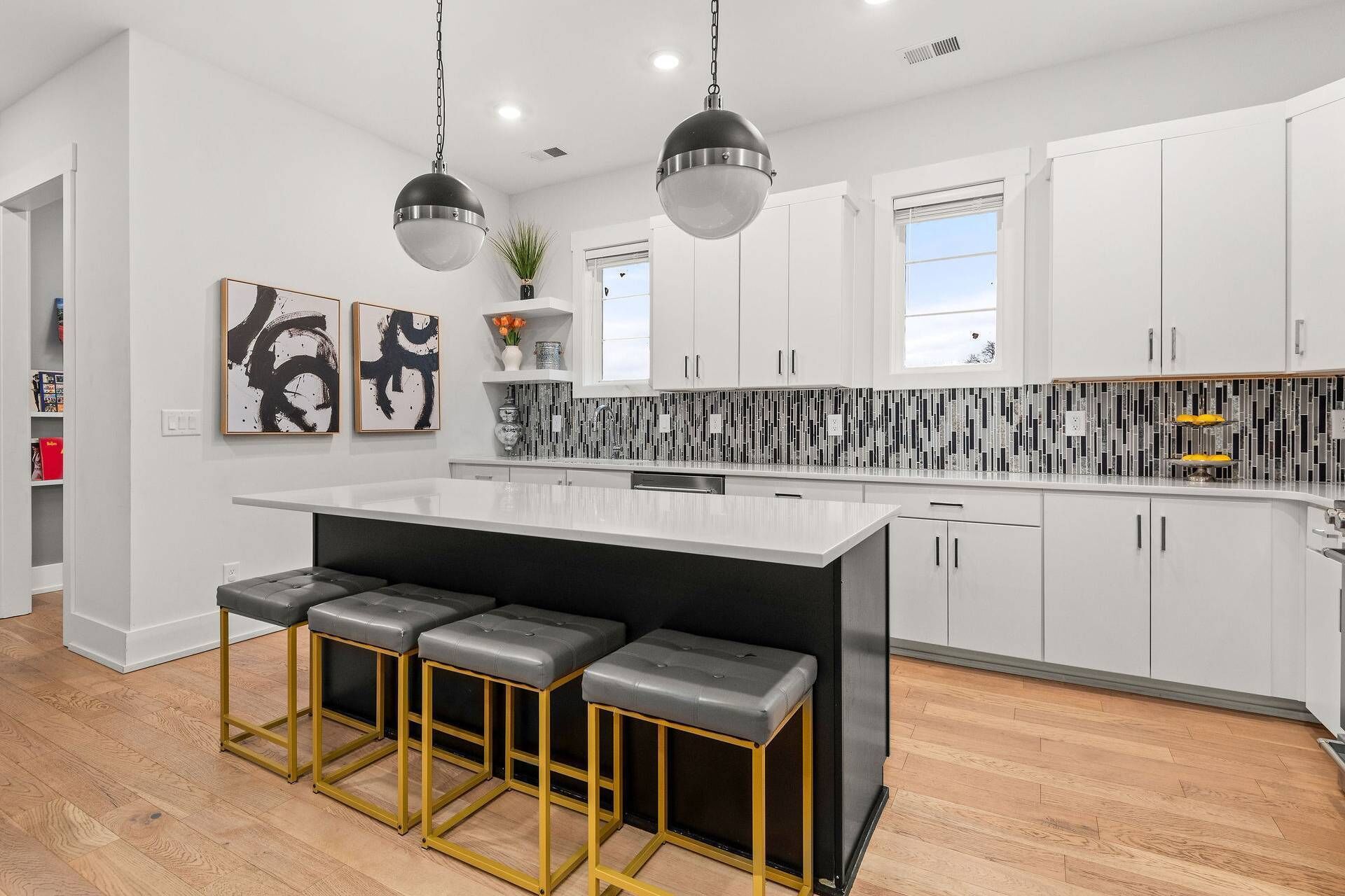 Bright contemporary kitchen with a marble-topped island, stainless appliances, and four bar stools—perfect for casual meals and entertaining.