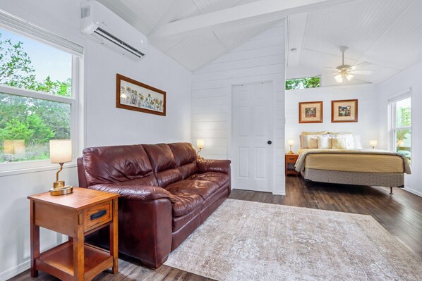 Step inside and you’ll find a bright and welcoming space styled in a modern cottage aesthetic, complete with clean lines, shiplap accents, and all the comforts of home. The main bedroom nook features a plush queen-sized bed that invites you to sleep in and savor slow mornings. The private bathroom offers a walk-in shower, single vanity, and everything you need to freshen up after a day of tubing or exploring.