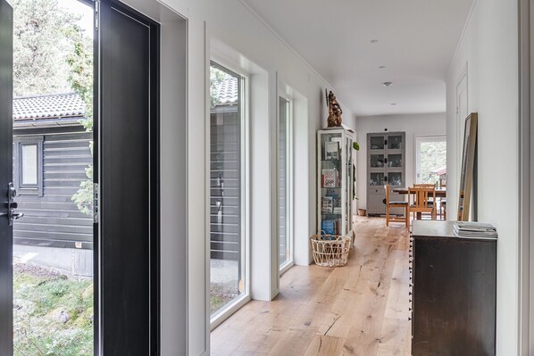 The house has four bedrooms. The master bedroom is equipped with a 1.80 m double bed and an adjustable desk for work. One bedroom has a bunk bed with space for up to three people. The other two bedrooms have double beds of 1.40 m each, one of which also has a desk and computer screen. There is a large and modern fully equipped kitchen, adapted for large dinners and baking, and a spacious living room with a large sofa facing the forest and a glimpse of the lake. The house has two fully tiled bathrooms in natural granite, with both a shower and a bathtub. There is also a separate laundry room with a washing machine, dryer and its own entrance. For a comfortable temperature all year round, there are two heat and AC pumps. Fiber internet, TV with Google Chromecast, cinema sound and HDMI connection as well as two dedicated workplaces make the house well suited for remote work. For quiet days and evenings, there are plenty of board games and books.