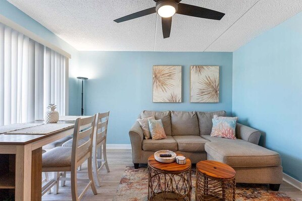 Welcome to Harbor Light #317 in North Wildwood, an oceanfront condo with beautiful ocean views. This one-bedroom unit sleeps up to six guests and is ideal for families or friends. The bedroom includes two double beds, and the living area offers a sleeper sofa for added flexibility.
