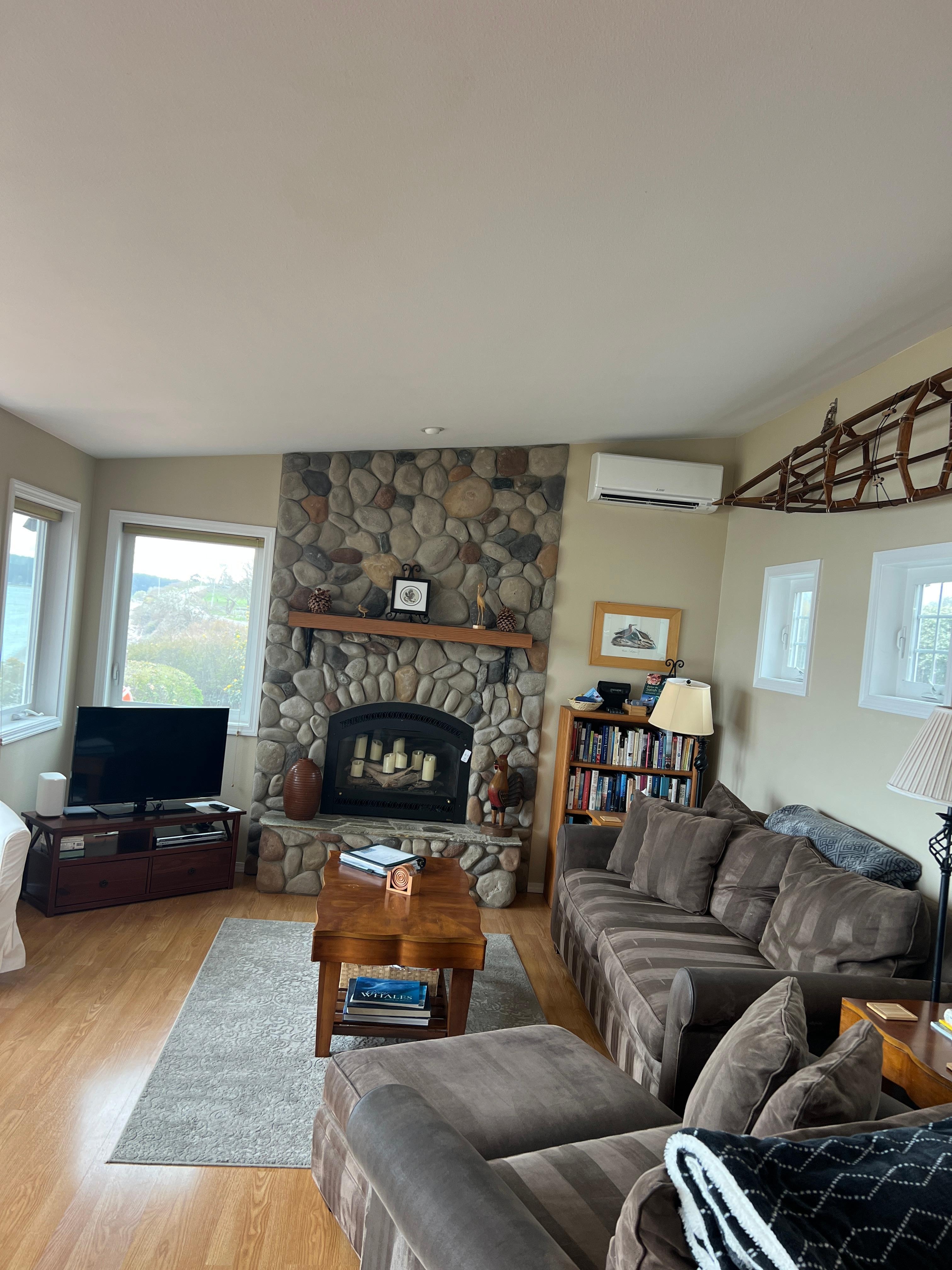 El día trae hermosas vistas de botes, focas y nutrias jugando en el agua, y de los picos nevados de las montañas olímpicas que se elevan en la distancia más allá de las costas de Penn Cove. Hacia el este también se vislumbran las montañas Cascade. La casa está orientada al sur para capturar el calor del sol en una gran terraza privada cuando hace buen tiempo, o inspirar el romance viendo olas agitadas por la tormenta mientras se sienta cómodamente en el interior junto a la gran chimenea de piedra de gas.