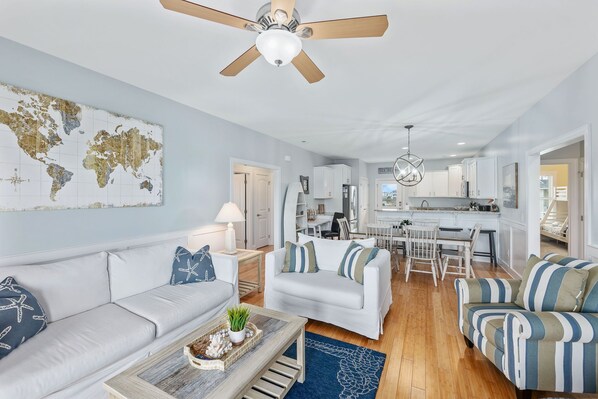 This 4 bedroom, 2 bath home is just steps from the beach and features gorgeous beach views. The open concept kitchen/living/dining area allows meals to be prepped in the fully stocked kitchen, while conversing with family and friends.