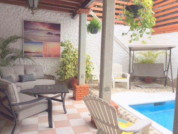 Nos complace darle la bienvenida en esta Su Casa de Vacaciones Saturday*Inn Guest house. con servicio domestico de limpieza y ricos desayunos completos incluidos. Casa privada en dos niveles, con 6 exclusivas y confortables habitaciones, con 5 baños completos, ventiladores de techo fan, con una capacidad maxima para hospedar comodamente a 12 personas, equipada con cocina completa, vajilla y cubiertos, estufa, microondas y refrigerador, estan en disposición; desayunador comedor, confortable sala de TV..pantalla de smart 50' con Sky, satelital. Wi fi, agradable terraza con vista panoramica con hermosas puestas de sol, una piscina chica agua intenperie con calentador solar, y una pequeña area de juegos.