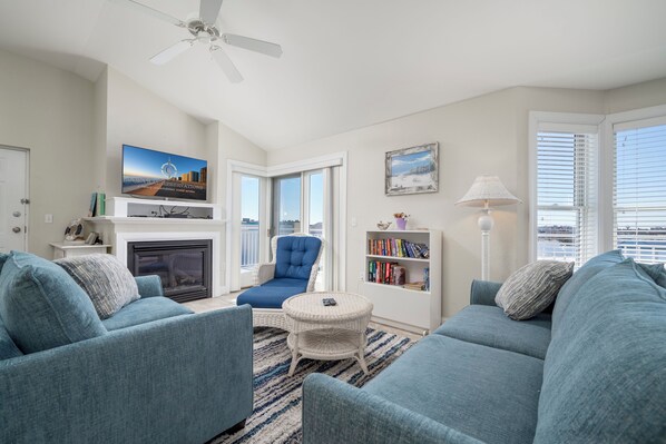 Your family of 8 will enjoy this Spacious 3 bedroom, 2 Bath, Ocean Block Condo located on 25th street featuring panoramic views of the ocean and bay from the large wrap around balcony one block from the boardwalk. This Beauty offers an open floor plan with warm southern exposure. The living room features vaulted ceilings, fireplace, ceiling fan and a queen sleeper sofa. Your family will enjoy preparing meals in the fully equipped kitchen. For your added convenience there is a washer and dryer. The primary bedroom features a king bed, tv and private bath with shower/tub combo. The second bedroom features a queen bed and ceiling fan. The third bedroom features 2 Twin beds, tv, and a ceiling fan. The hall bath offers a shower/tub combo.