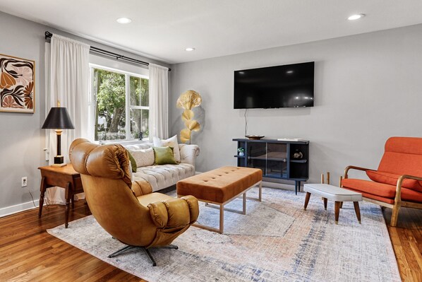 The living room provides a comfortable place to lounge on mid-century modern furniture in front of a large flat-screen Smart TV, perfect for streaming your favorite shows. Local artwork decorates the space throughout the home.