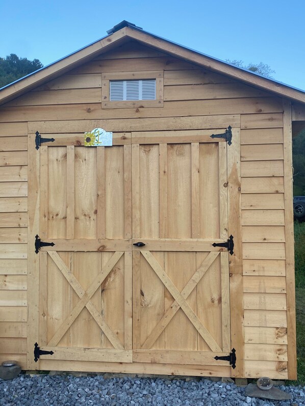 Keep your belongings dry, sleep off the ground (on the two cots provided) and save room in your car by not having to pack a tent or cooler! Your lockable shed comes with one small dining table and two chairs, a small solar pack with three lights (with a USB port to charge your phone) and a terracotta pot shed warmer.