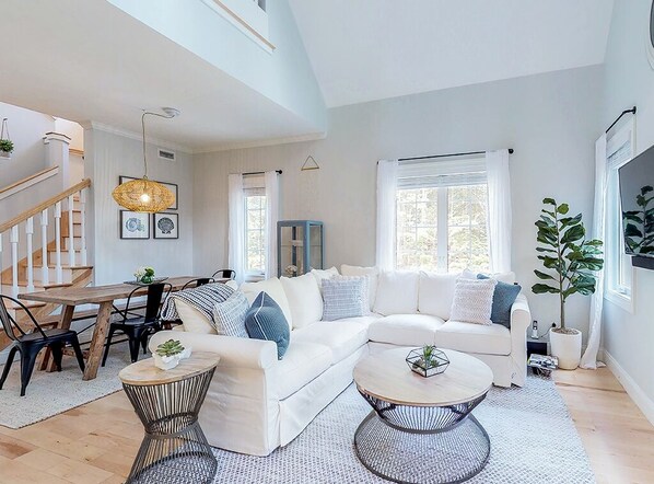 Un nuevo refugio en la playa, ubicado a 1. 1 millas del centro de Ogunquit y 1. 2 millas de la hermosa playa de Ogunquit. Hay muchas cosas que hacer en esta pintoresca y pequeña ciudad costera, desde las tiendas hasta los restaurantes elegantes, Ogunquit lo tiene todo. Su refugio moderno ubicado en casi 2 acres justo en la calle de la ciudad. Incluye 3 dormitorios y 2. 5 baños con 1900 pies cuadrados de espacio. Al entrar a la casa con su código inteligente personal, se lo recibe con un área de entrada pintoresca con cubículos integrados para zapatos y abrigos y medio baño. Al final del pasillo, pasará por un divertido comedor y una suite principal de camino a la sala de estar y la cocina. Todos los muebles son nuevos. El dormitorio principal del primer piso tiene una cama king y un baño principal adjunto. El baño principal tiene dos tocadores y una amplia ducha con mampara de vidrio. La sala de estar tiene un techo abovedado que se abre al loft en el piso de arriba con una gran sección y una TV inteligente de 50 "LED con sonido envolvente Bluetooth. La cocina moderna ofrece un lugar maravilloso para cocinar panqueques por la mañana o simplemente sentarse en la isla de cuarzo y disfrutar de una taza de café.