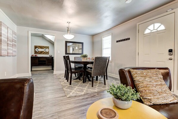 Este listado es para ambas casas en un lote compartido. La casa delantera (~ 880 pies cuadrados) tiene 2 dormitorios y 2 baños. La casa trasera espaciosa (~ 1,500 pies cuadrados) tiene 3 dormitorios y 3 baños. El arreglo es perfecto para grupos pequeños o familias. Está a poca distancia a pie del distrito de la Plaza y a un corto trayecto en automóvil del centro o del parque estatal de ferias. El acceso rápido a la I-40 significa que casi cualquier cosa en OKC está a minutos de distancia.
