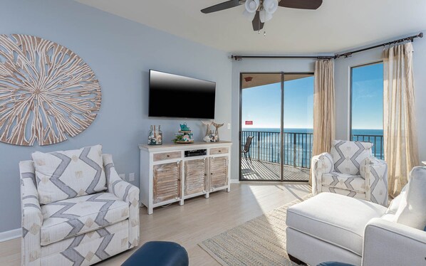 Este condominio de dos dormitorios y dos baños se encuentra en una excelente ubicación para sus vacaciones en la playa. Sus áreas de estar y comedor tienen espejos de piso a techo, y hay cómodos asientos para que ocupe cuando se relaja y disfruta de la televisión de pantalla plana y el reproductor de DVD. La cocina cuenta con una estufa de superficie plana y todas las herramientas de cocina que necesita para preparar una o dos comidas. Hay un par de taburetes en la barra de desayuno y una mesa de comedor de vidrio con varias sillas, y el balcón también tiene una mesa y cuatro sillas, para que pueda comer en el balcón de azulejos mientras contempla el hermoso paisaje. El dormitorio principal tiene una cama king-size, un televisor de pantalla plana, acceso al balcón y un baño con lavabo, tocador y silla ampliados, y una combinación de bañera y ducha. Hay un par de camas tamaño queen en la habitación de huéspedes, y también hay un televisor de pantalla plana, y el baño ofrece un lavabo, tocador y una combinación de bañera y ducha.