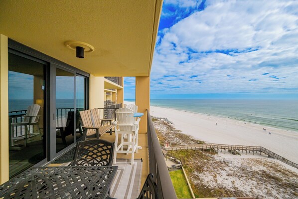 · Impresionante vista frontal del golfo desde el balcón con asientos para cuatro en la mesa y una tumbona
