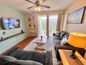 Prepare delicious meals and snacks in our fully equipped kitchen. The living room area, adorned with sliding glass doors, opens up to a screened balcony seating area, providing a tranquil space to unwind and enjoy the outdoors. Kick back and relax in the living room while watching your favorite shows and movies on the Roku TV.