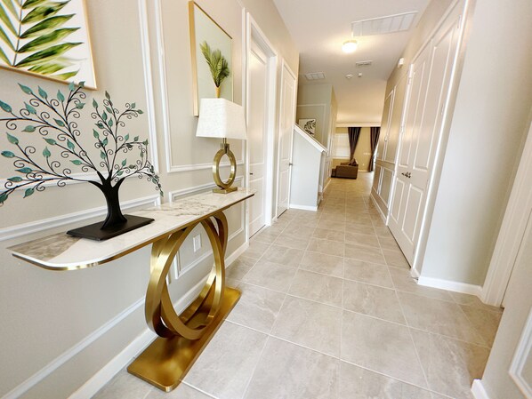 As you enter this 4,800 sqft tropical paradise, you'll be greeted by a spacious, sunlit open-plan living area where contemporary design meets tropical elegance. The living room boasts plush sofas, a large flat-screen TV, and tasteful décor, perfect for relaxing evenings after long days at the theme parks.