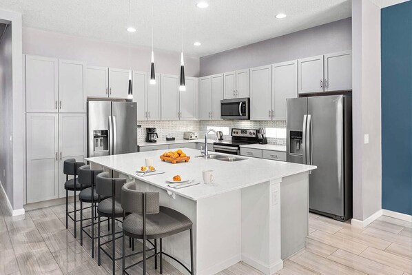 abastecido con utensilios de cocina, vajilla y cristalería. Las elegantes encimeras blancas son hermosas y funcionales, y se duplican como una barra de desayuno, rodeadas por 5 elegantes taburetes.