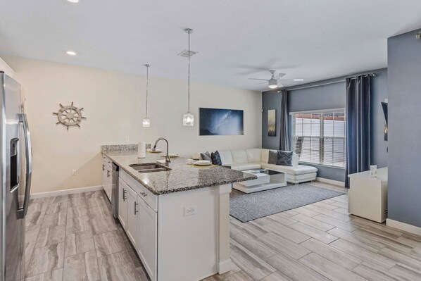 For the culinary enthusiasts, our modern kitchen boasts top-notch appliances and ample counter space. Prepare delicious meals for the whole family, or grab a quick snack before heading out for more fun.