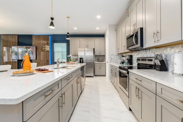 La cocina de al lado ofrece todo lo que necesitará para comer, incluyendo una nevera / congelador grande, horno, microondas, lavavajillas, cafetera, tostadora y armarios con utensilios de cocina, vajilla y cristalería. Las islas blancas y brillantes facilitan la preparación, y funcionan como una barra de desayuno, rodeada por 5 elegantes taburetes.