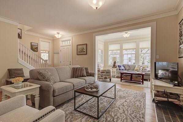 Upstairs: The primary bedroom shares the same bright outlook as the main floor sun room, and includes a private full bath and a quiet corner to get away from the bustle. A TV and DVD player add to the options there. The queen guest bedroom and the bunk room share a second full bath, and the laundry with full size washer and dryer is conveniently located on this floor. The bunk room is popular with kids, but we purposely used full depth mattresses, so these twin size beds are comfortable for all.