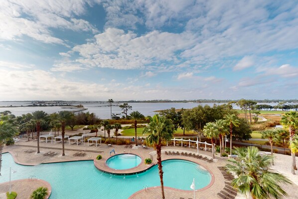 Condominio Bayview con piscina compartida, bañera de hidromasaje y balcón privado.
