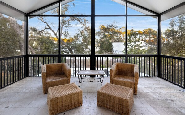 The first-floor guest room, with king bed, private bath, and custom-tiled walk-in shower, opens onto a unique and cozy screened-in porch. With comfy seating, this is a delightful space, ideal for kicking back with a good book or an afternoon nap.