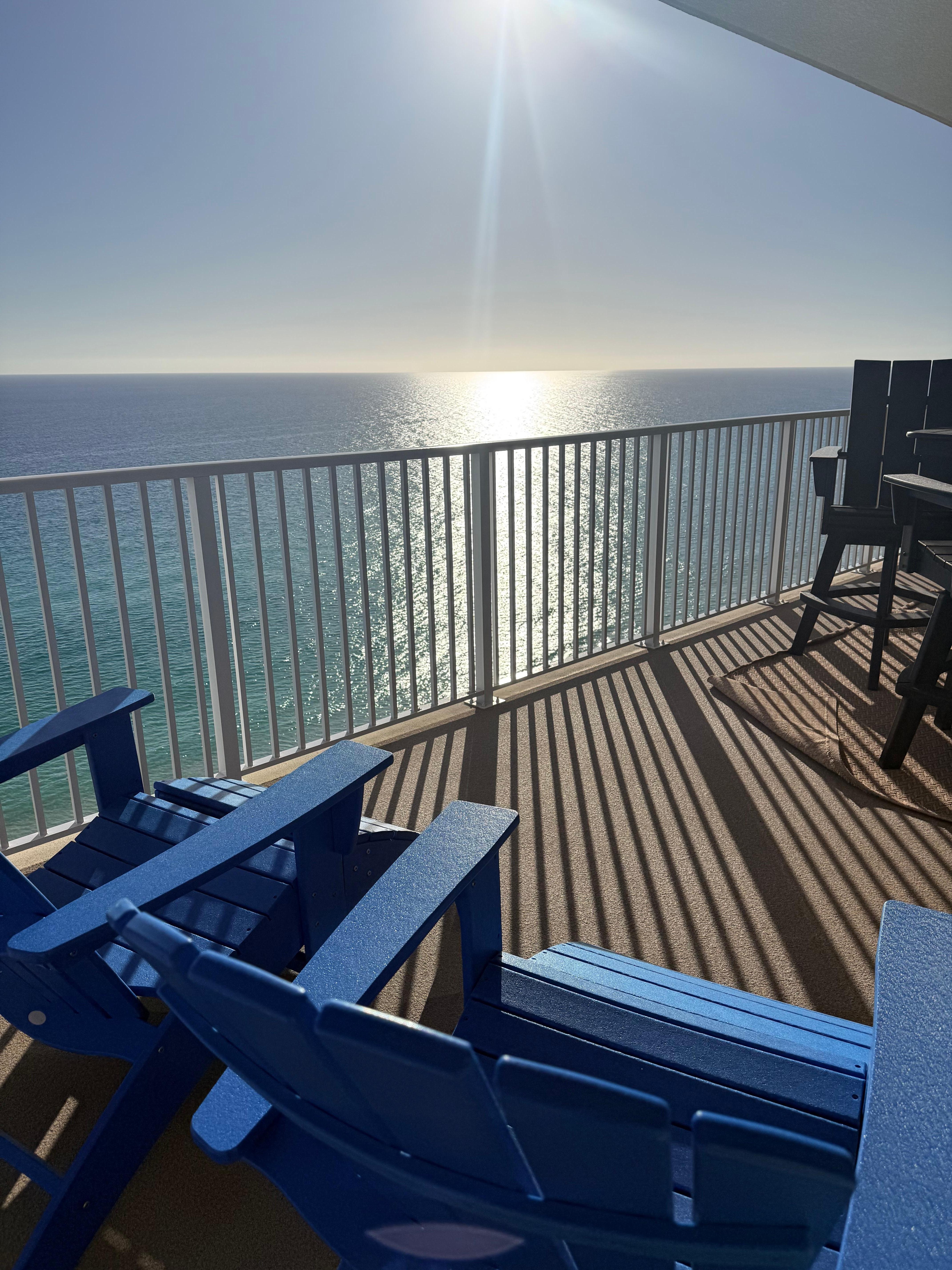 Welcome to Tropic Winds 1601! Our beautiful, ocean-front, 2-bed/2-bath condo is located on the 16th floor of the Tropic Winds building with unparalleled, panoramic views of the Gulf of Mexico and the coastline of Panama City Beach. With room to accommodate 6 guests, come enjoy our luxurious open-concept condo, decorated with comfortable furnishings, coastal contemporary décor, luxury floors, and high-end accessories. An end unit, our oversized balcony has enough room for the whole family to enjoy the sights and sounds of the Emerald Coast. Tropic Winds 1601 has a free, covered, dedicated parking space on the first floor of the building, making getting to and from our home quick and easy, with no street crossing and a quick elevator ride to the 16th floor.