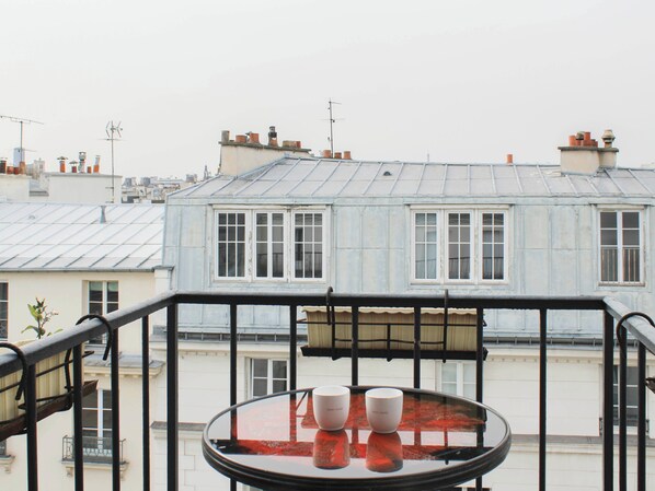 - a room with a double bed on a quiet courtyard; - a small fitted kitchen; - a functional bathroom with bathtub; - a dining room with large table and two benches; - a dressing room with wardrobe; - a balcony with a table and two stools, a beautiful view of the rooftops of Paris and Beaubourg and then the Eiffel Tower in the distance; - and a lounge area with a convertible sofa to relax after a busy day.