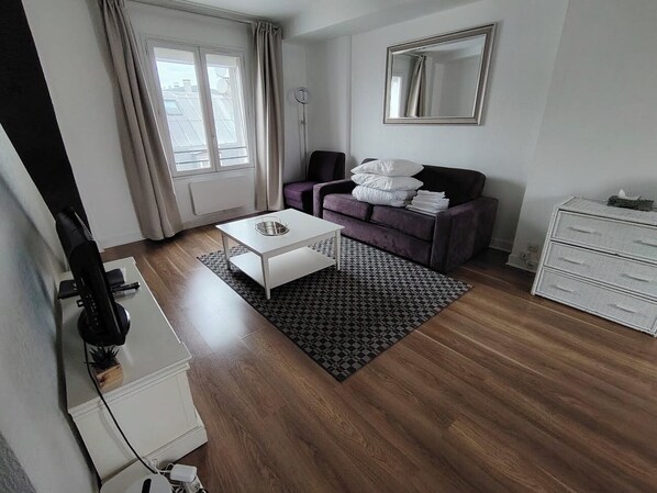 This spacious 45-sqm apartment is situated on the 6th floor of a secure building with an elevator. The living area serves as a multifunctional space, ideal for relaxing, dining, or working. It is furnished with a comfortable sofa bed, flat-screen TV, and a dining table with chairs. The high-speed Wi-Fi connection (1 Gbps) is perfect for remote work or streaming your favorite content.