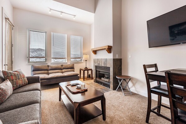 Step into the expansive living area, where two sleeper sofas surround a cozy gas fireplace and a large TV. Relax in comfort after a day on the slopes or gather for movie nights with loved ones.