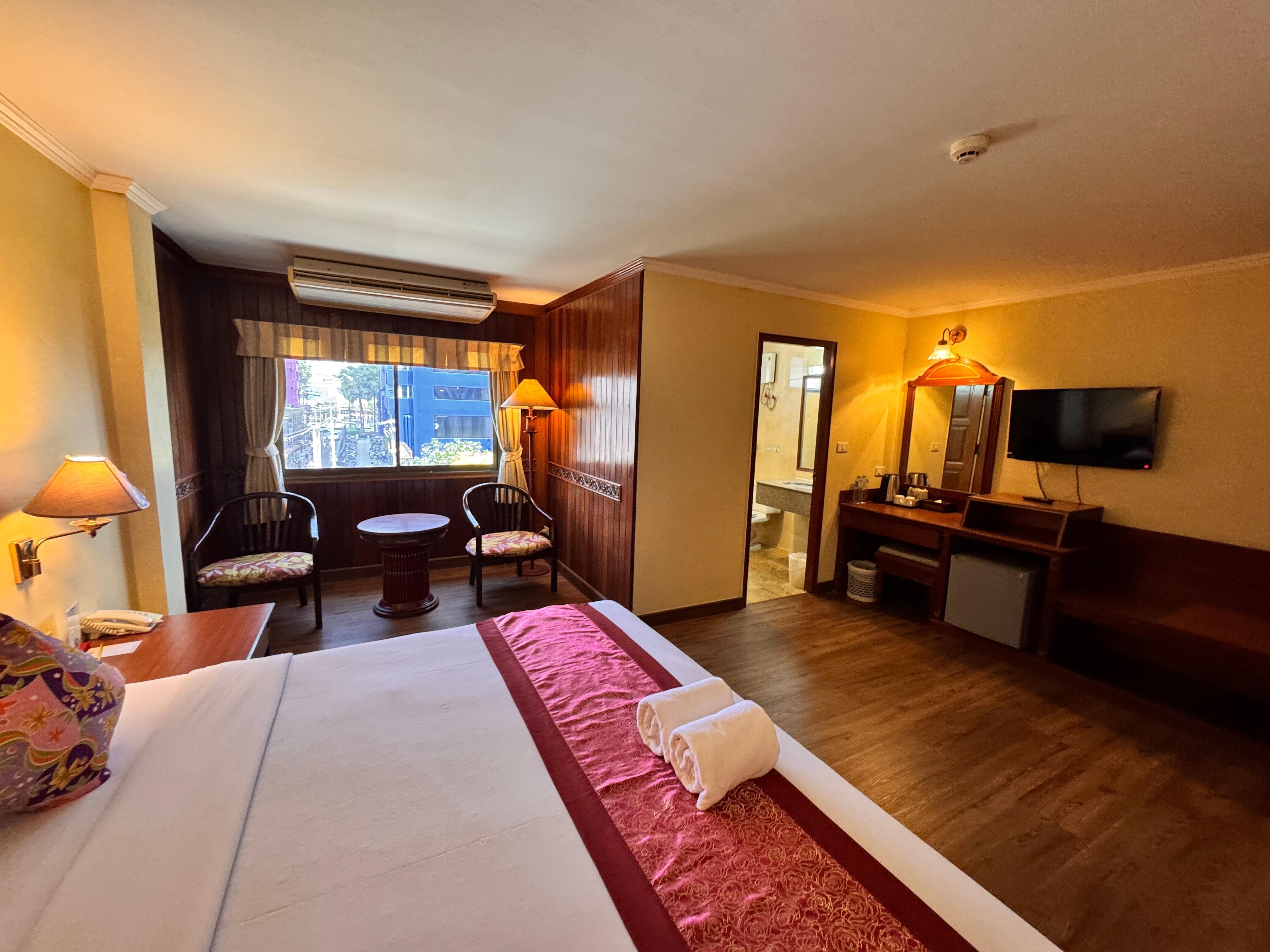 Convenient location close to terminal 21 and many shopping and eateries. Close to beach and Main Street. Spacious room large bed. Pool table and vending machines (even sold beer)