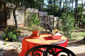 Sentados en el patio bañado por el sol, se pueden preparar comidas al aire libre en una parrilla de gas mientras se disfruta del hermoso jardín.