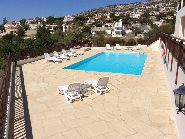 Sleeps 5/6. 2 bedroom top floor penthouse apartment with shared pool. Air-con in all rooms. With fitted fly screens to all windows for your comfort during those hot summer nights! Enjoys uninterrupted stunning panoramic views of the Mediterranean sea and beautiful surrounding countryside. Access to the very large terrace from bedroom and the living area. Quiet and private location. A sun worshippers heaven. A very short driving distance to Coral Bay with its exciting nightlife, various bars, restaurants and beach. Paphos centre is 15 minutes drive away. The village is within walking distance with its bars and traditional tavernas.