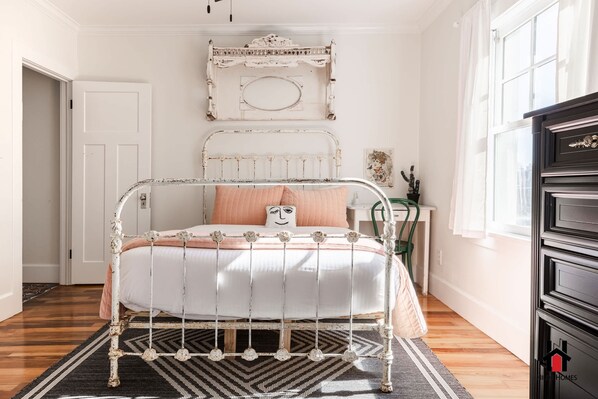 Sink into a plush full-sized bed in this bedroom decorated in a 1920s antique style – vintage simplicity at its finest! It also features a mini desk for a small workstation or vanity.