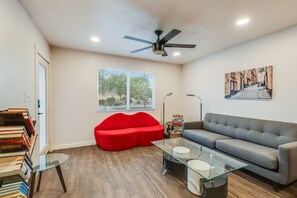 The living room is oversized with a themed mural. It boasts two modern sofas, a club chair, a dining room table with four chairs, and a bistro table with two barstools. In addition to the living room's 55" TV, there is a record player with about 30 albums and a lending library with a wide selection of books.
