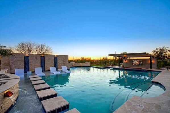 Outdoor Oasis: Arrive at the estate and you will immediately be drawn to the resort style backyard that has a state-of-the-art heated pool, oversized spa, large slide, water features and a covered swim up bar complete with 65 inch TV and fridge to keep those beverages cold. The outdoor area also has plush lounge seating, in-pool seating and lounge chairs to bask in the Arizona sun. Also included for your entertainment is your own putting green, grilling station, firepit, and cornhole!