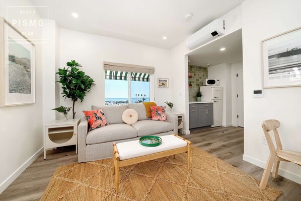 Our spacious suites feature luxurious California King Casper mattresses, organic cotton bedding, and a fully equipped kitchen for a home-away-from-home experience. Enjoy premium amenities like a memory foam pull-out sofa, Malin + Goetz bath products, and local artwork, all within walking distance of beautiful Pismo Beach.