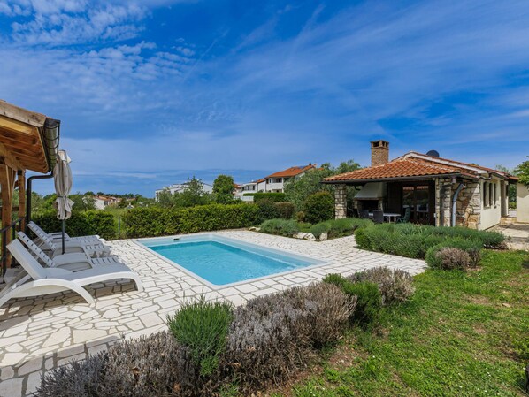 Nova Vas a 6 km de Poreč: Casa unifamiliar "Ema", bonita. A 500 m del centro de Nova Vas, lugar soleado, a 5 km del mar. Privado: terreno 300 m2 (vallada), jardín pequeño con césped y plantas, piscina rectangular (6 x 3 m, 150 cm de profundidad, Disponible por temporada: 01.May. - 30.Sep.) con escalera interior. Ducha exterior, terraza (15 m2), muebles de jardín, barbacoa, parque infantil (tobogán, columpio). En el inmueble: acceso a internet, lavadora. Aparcamiento (para 2 coches) junto a la casa en el mismo terreno. Supermercado 600 m, restaurante 1 km, parada autobús 4.3 km, playa de gravilla 5 km, playa rocosa 5 km, zona para bañarse 5 km. Tenis 5 km, centro ecuestre 7 km, rutas de senderismo desde la casa 100 m, caminos para bicicletas 150 m. Atracciones en los alrededores: aquapark 10 km, amusement park 15 km.