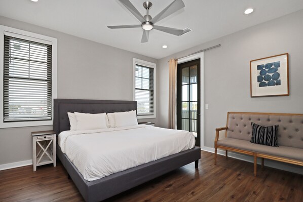 Upstairs, you'll discover a large sitting area with a TV, a full bath, and two additional bedrooms, including another master suite and a charming kids' bedroom with bunk beds. The highlight of this property is the top-floor balcony, which offers breathtaking views overlooking the lighthouse and bay, creating the ideal spot for sipping your morning coffee or enjoying a sunset cocktail.