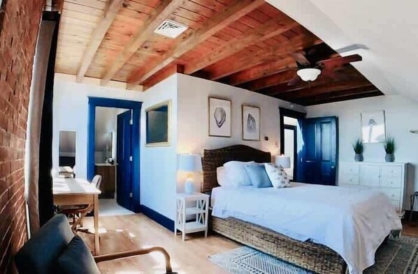 The third unit, features navy blue accents, skylights, historic brick walls, and wood beamed bedrooms. It encompasses the left side of the second floor and the entire third floor. The unit features a large living room with sectional. A bar table has seating for 8 and flows into a kitchen space with high end appliances and a half bath. Off of the kitchen is a private office space with a door that offers a queen pull out sofa and desk.
