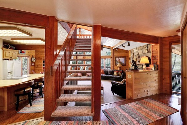 It`s easy to gather generations here. The walk out, ground level has an impressive game room with full size arcade games (DigDug, Asteroids Deluxe, Ms. Pac-Man, and Donkey Kong Junior), ping pong, and pool table for the kids to enjoy. The main level has a roomy living room for lounging with a book, a large kitchen with island for meals together, beautiful dining table, and an outside deck overlooking the tall pines and large yard.