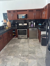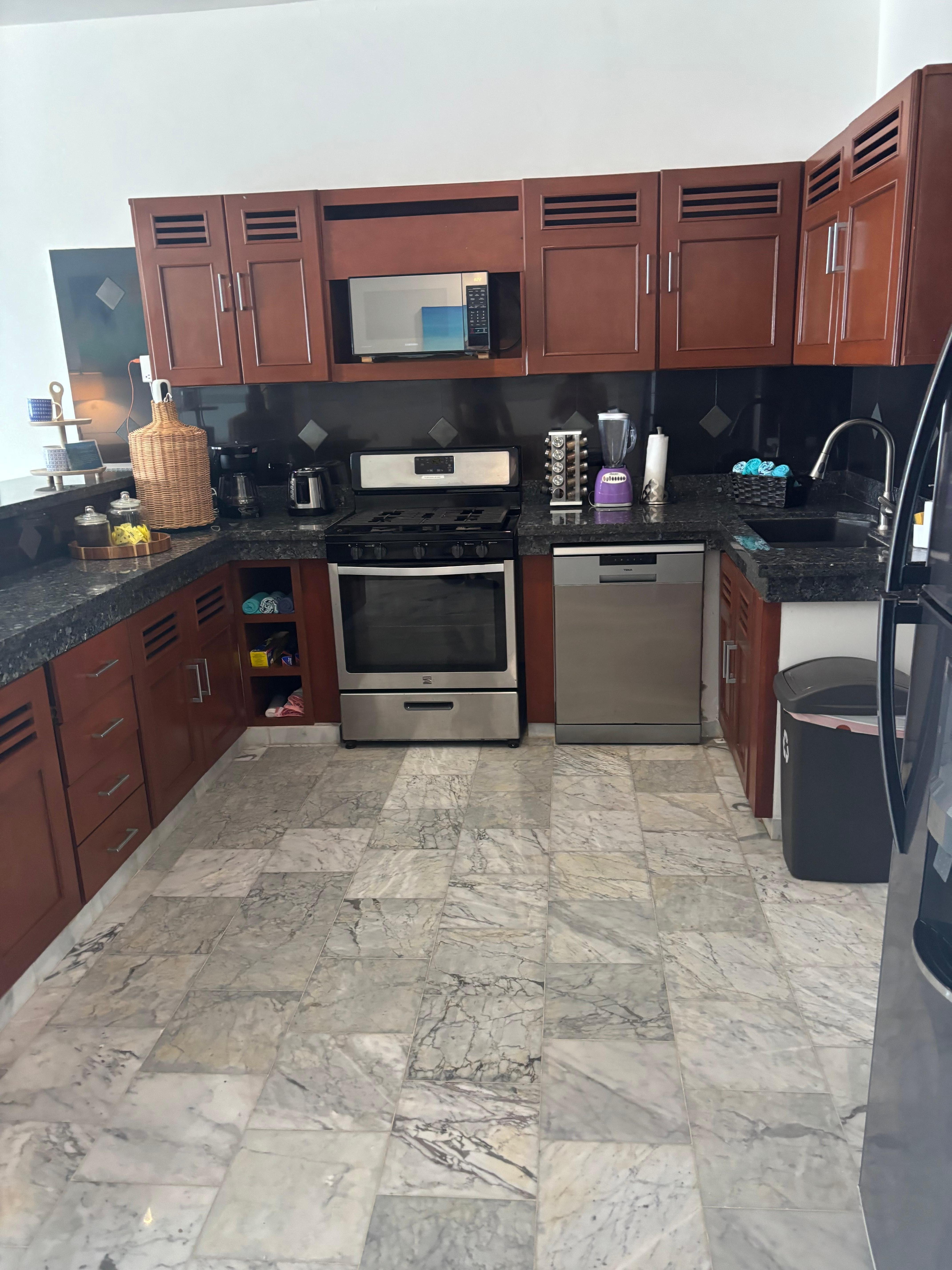 You can fall asleep listening to the gentle surf or wake up to the rising sun. There are two master bedrooms with king-sized beds and ensuite featuring walk in showers. There is also a half bath in the hallway for guests. The bedrooms have abundant closet space and the kitchen is fully equipped microwave, coffee maker, dishwasher and gas stove with granite counter tops and abundant counter space. The dining area can easily seat six people.