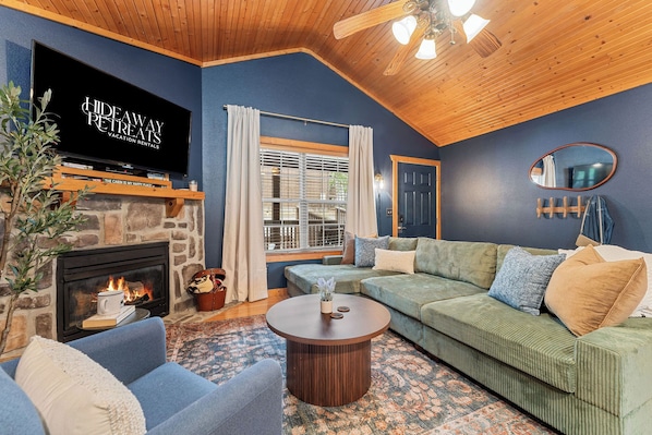 This is a standalone wood cabin, not a condo and not a townhouse. You have your own front door, your own patio, and your own quiet corner of Stonebridge Resort's wooded property. The interior was recently refreshed with a moody, cohesive design — warm tones, intentional finishes, and a look that feels current without trying too hard.