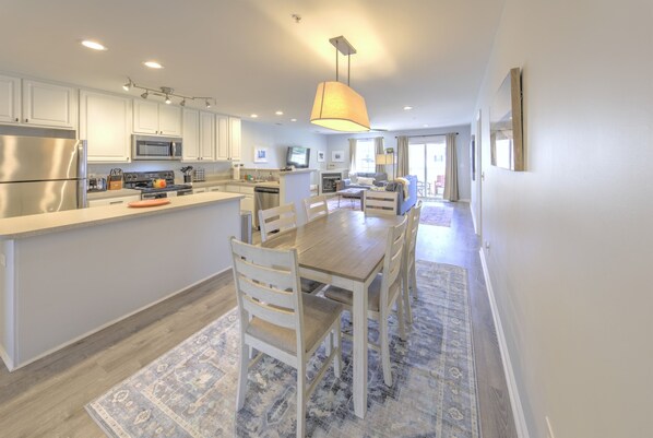 El condominio duerme cómodamente 8 (1 rey - Dormitorio principal con baño completo, 1 cama queen, 2 camas dobles / completas). El dormitorio principal tiene un baño completo adjunto y los dos dormitorios restantes tienen acceso al baño principal completo. Cada habitación tiene una cómoda, un armario, un ventilador de techo y un televisor de pantalla plana con Roku para transmitir tus programas favoritos.