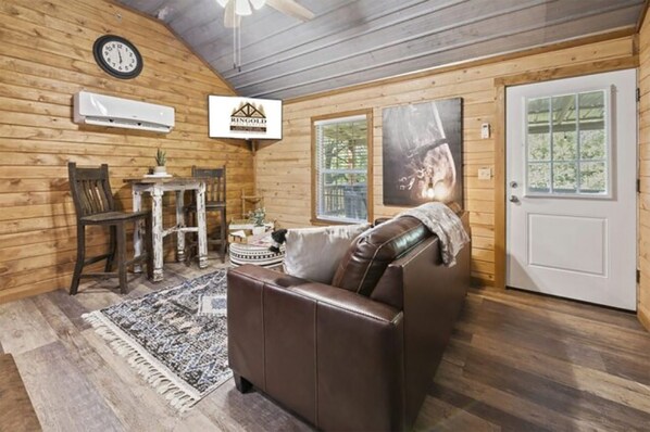 “Playin’ Hooky” is a cute little tiny cabin conveniently located on the road going into the park at the North end of Pine Creek Lake. Less than one mile to Little River Park and the lake. Perfect for going fishing, boating, swimming, kayaking or just taking a stroll at the lake. Cozy and Ideal for fisherman, a couples getaway or a small family. The adorable kitchen has a retro fridge, microwave and full size electric cookstove.