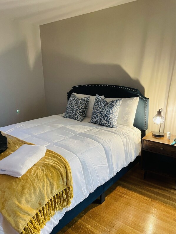 All bedrooms are on the second floor. Bedroom 1 has a full sized bed, desk, night stand and desk lamp. Bedroom 2 has a queen bed, nightstand, lamp and a double convertible loveseat. The third room has a queen bed, and a convertible chair, desk and office chair. Full bathroom has tub/shower, shampoo, conditioner, soap, hairdryer, bidet and hamper.